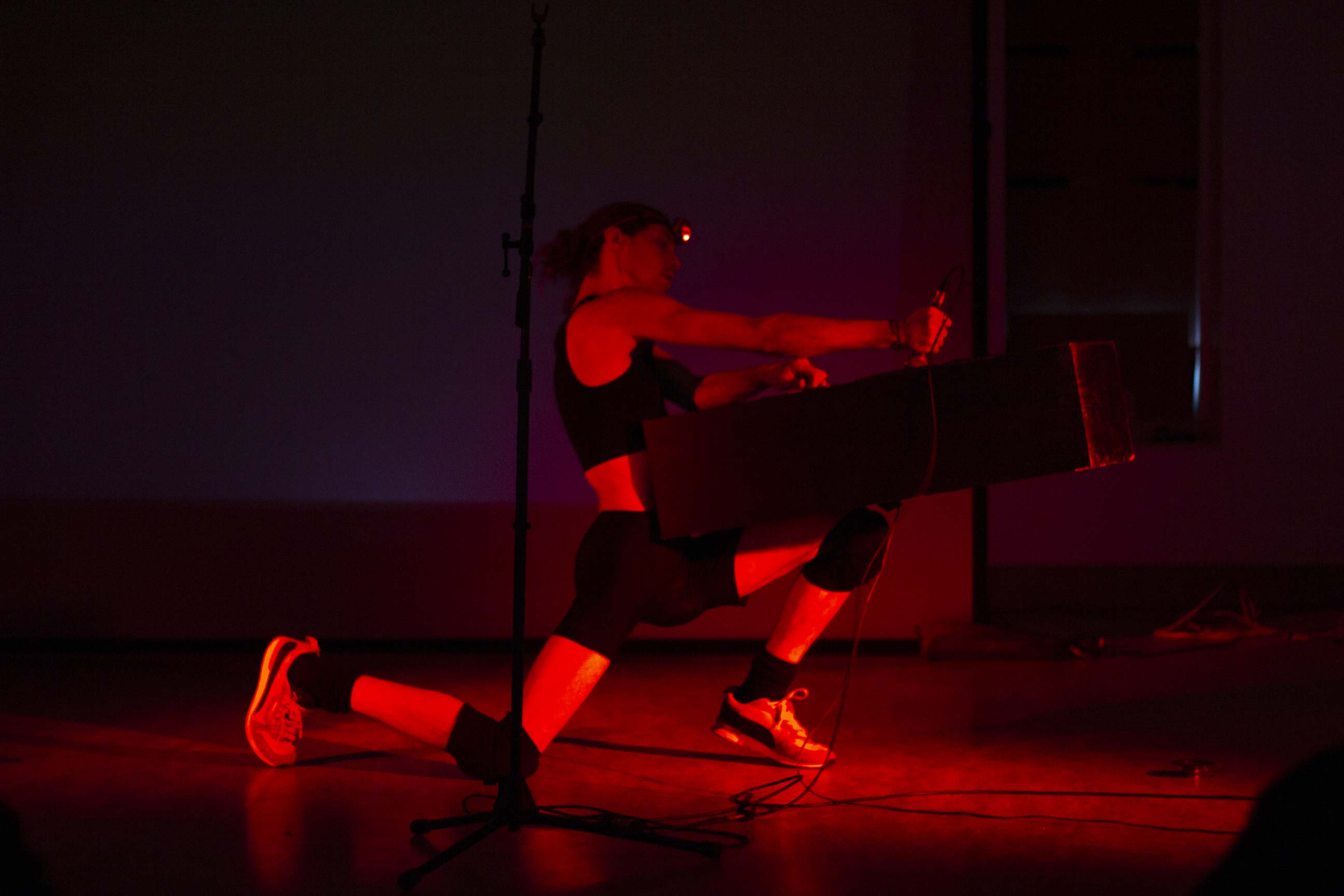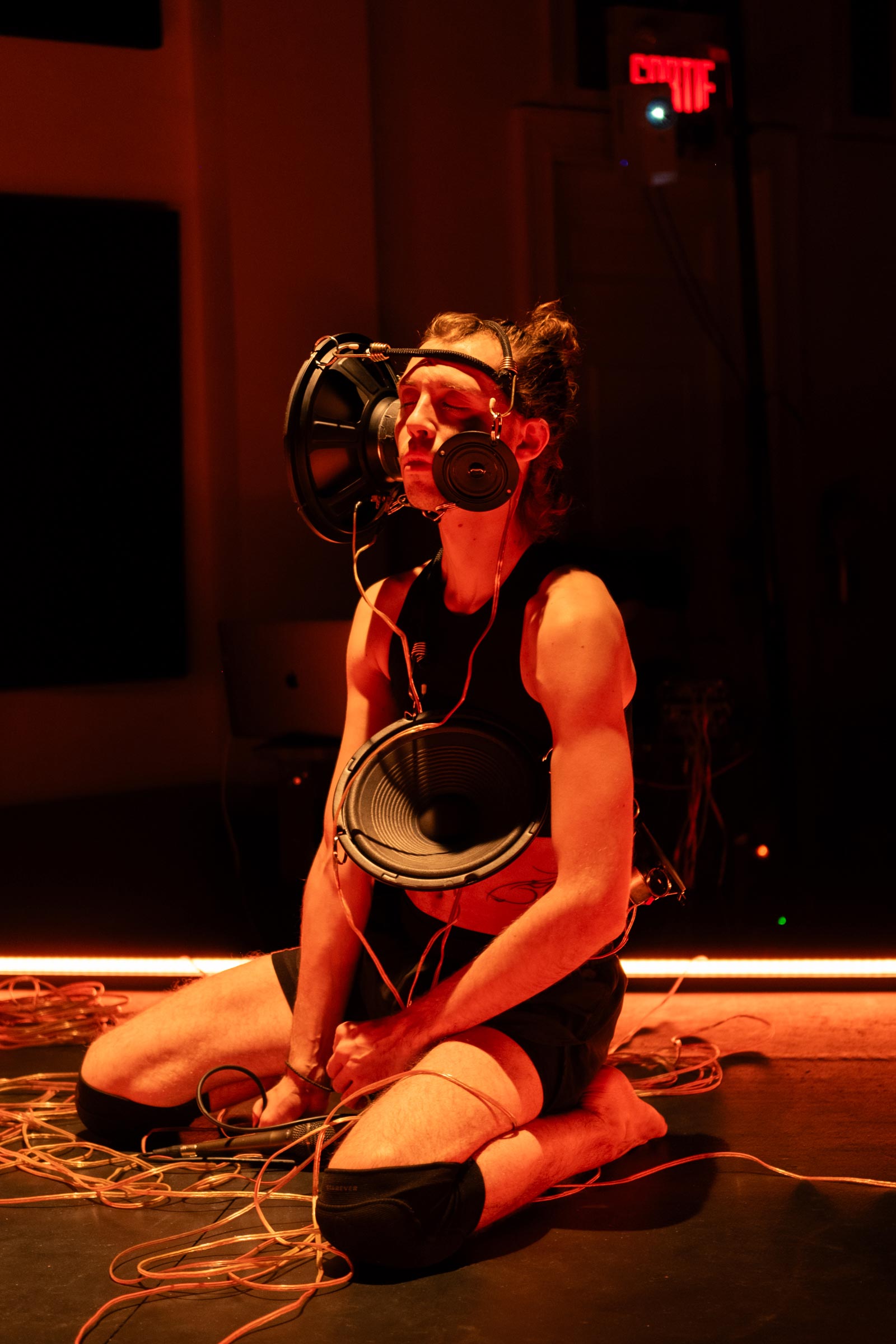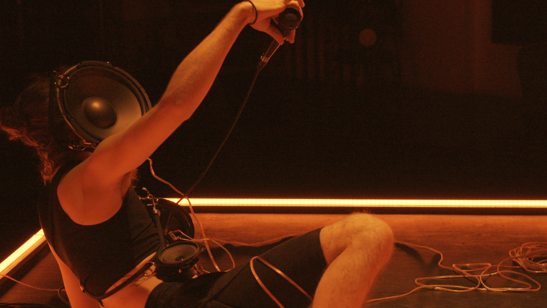 Cette deuxième partie explore le rôle de support que les dispositifs techniques apportent aux artistes qui peuplent la scène. À travers des membranes d’enceintes strappé à même le corps, la performance questionne comment traduire la vulnérabilité des outils techniques en devenant leur soutien sur scène.