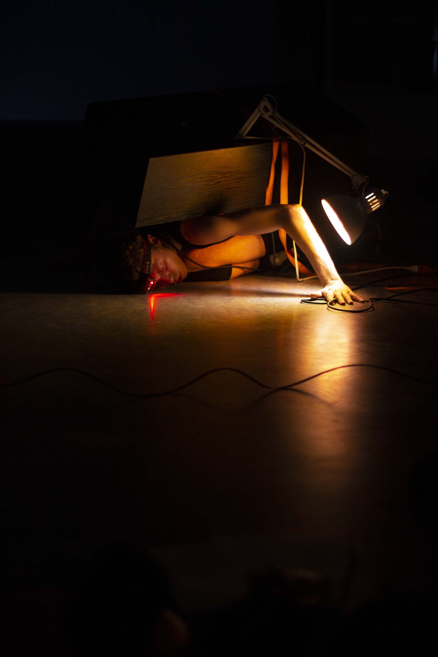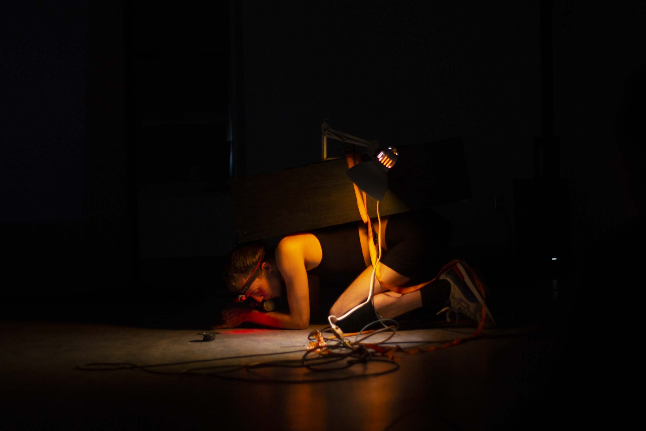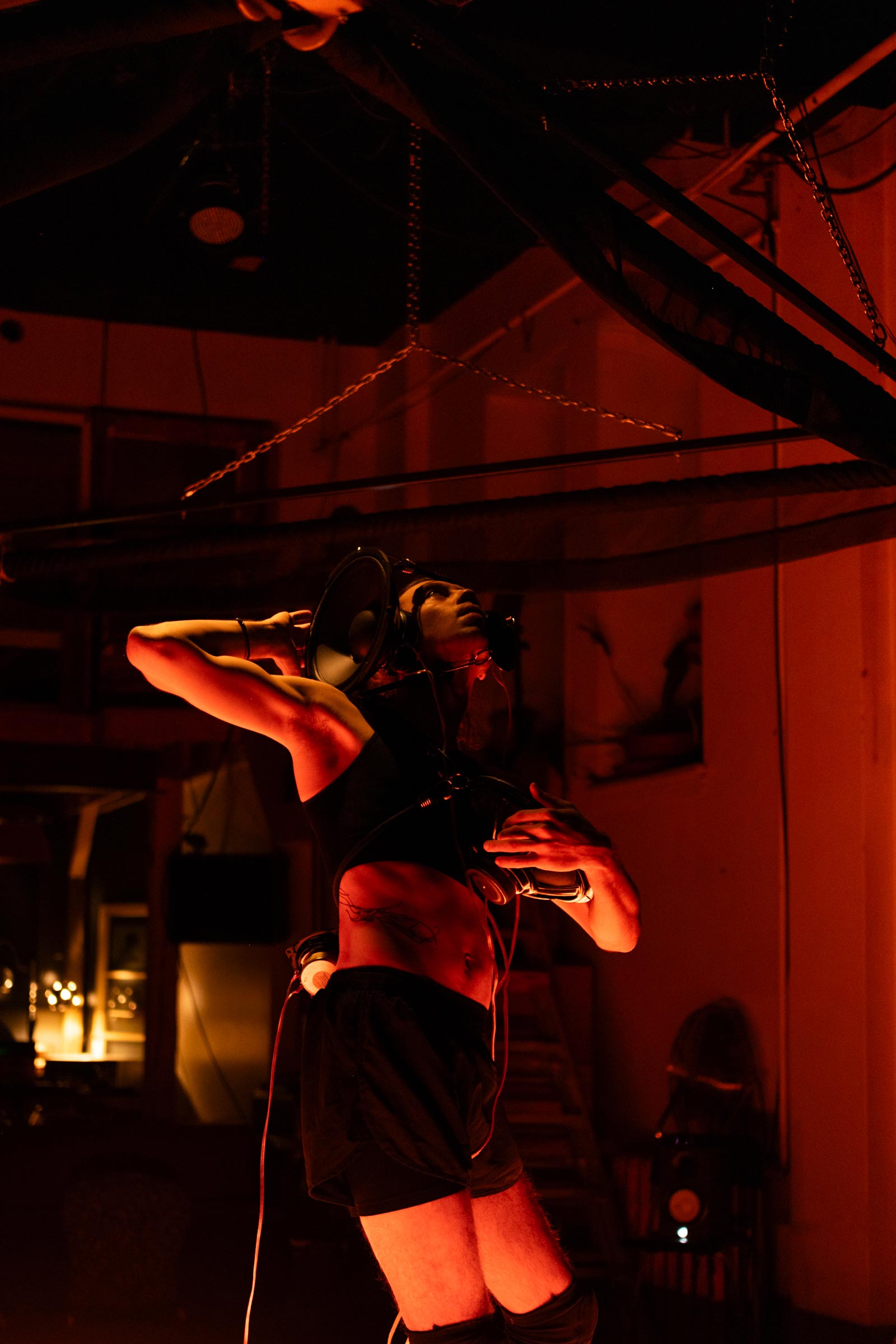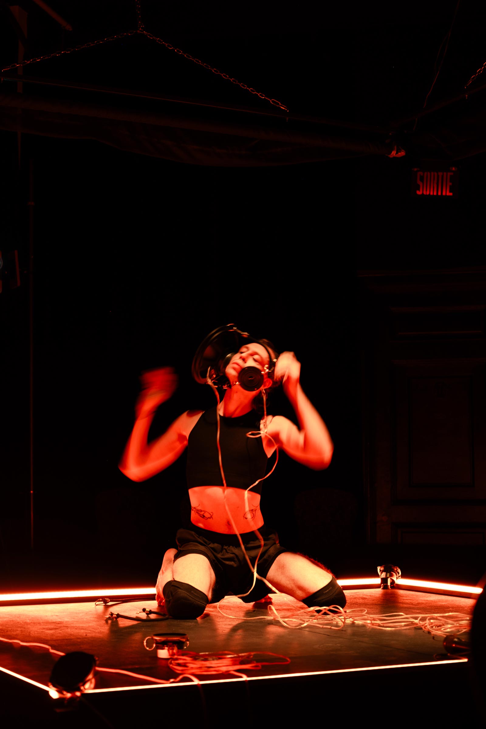 Cette deuxième partie explore le rôle de support que les dispositifs techniques apportent aux artistes qui peuplent la scène. À travers des membranes d’enceintes strappé à même le corps, la performance questionne comment traduire la vulnérabilité des outils techniques en devenant leur soutien sur scène.